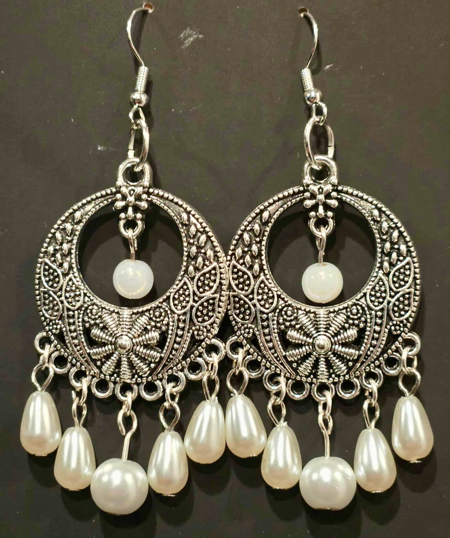 The overall design blends antique silver detailing with white pearly accents, giving the earrings an elegant, ethnic, and festive look.