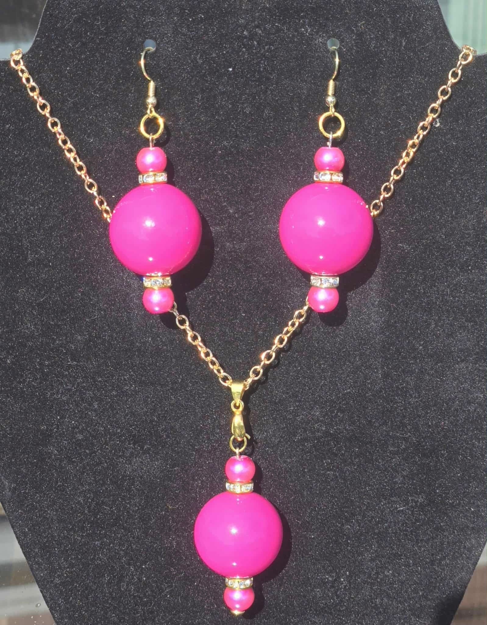 - Necklace: Gold-tone chain with a large pink bead pendant, highlighted by smaller coordinating beads and rhinestone accents.