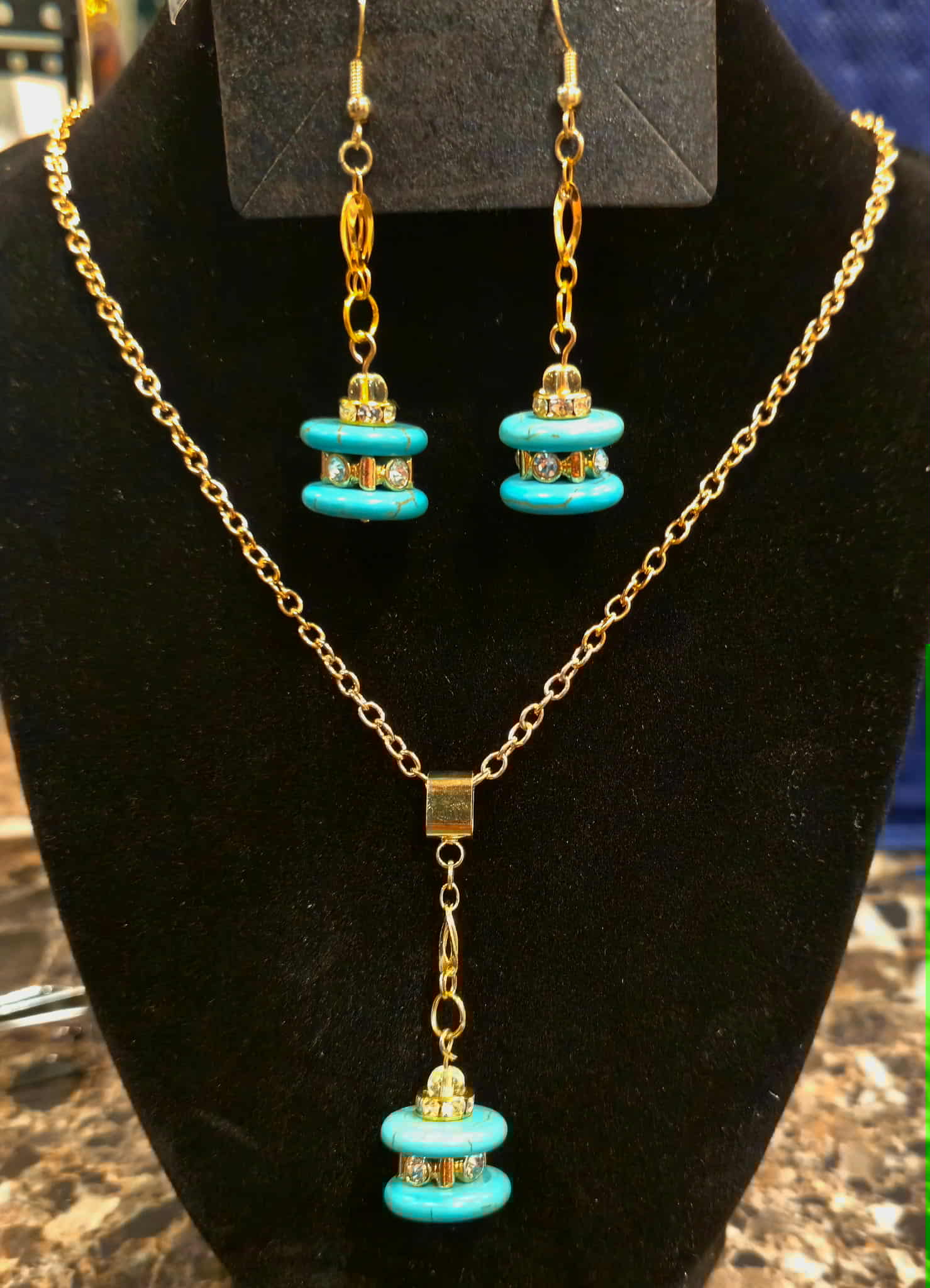 Make a bold statement with this handcrafted necklace and earring set, featuring vibrant turquoise beads paired with sparkling crystal accents. The golden chain and findings add a touch of warmth and elegance, creating the perfect balance between modern style and timeless beauty. Lightweight and versatile, this set is ideal for elevating casual outfits or adding a pop of color to evening wear. A must-have accessory for those who love unique, eye-catching jewelry.
