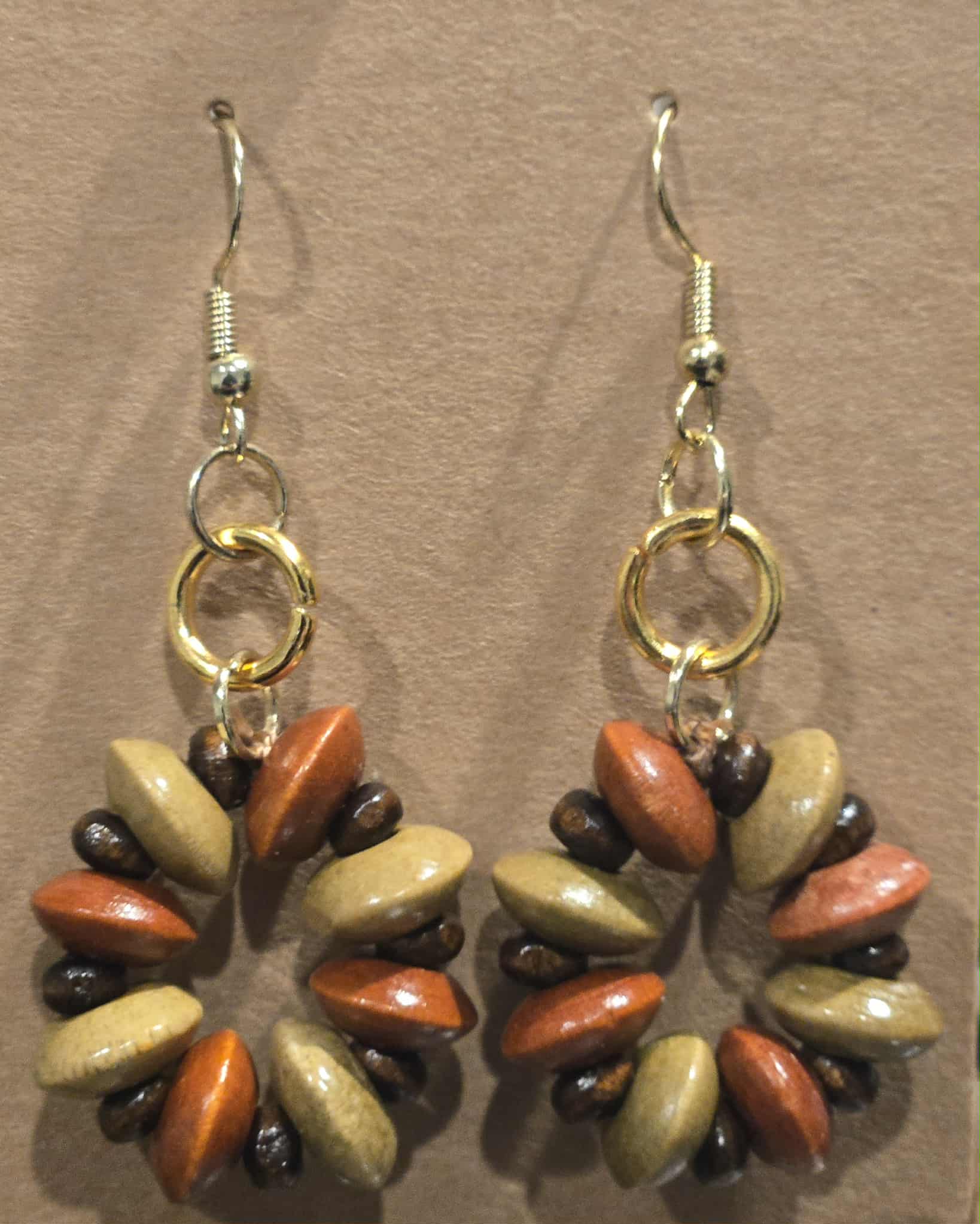 - Design: Circular hoop made of alternating light brown, dark brown, and terracotta-toned wooden beads.