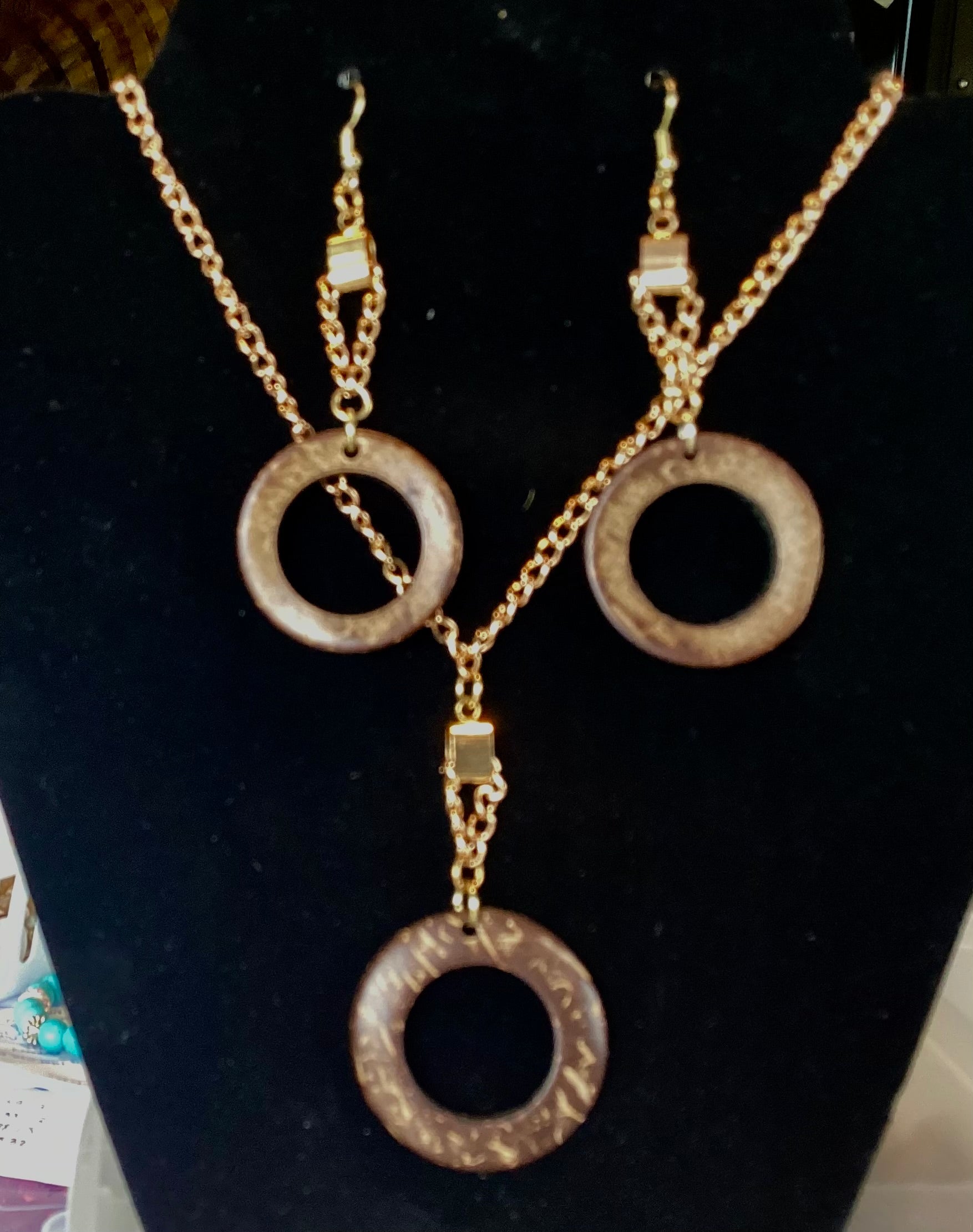 Make a bold, earthy statement with this handcrafted necklace and earring set. Featuring circular brown wood-like rings paired with elegant gold-tone chains, this design perfectly blends natural charm with modern sophistication. The lightweight materials and geometric style make it a versatile choice for both casual and dressy looks.