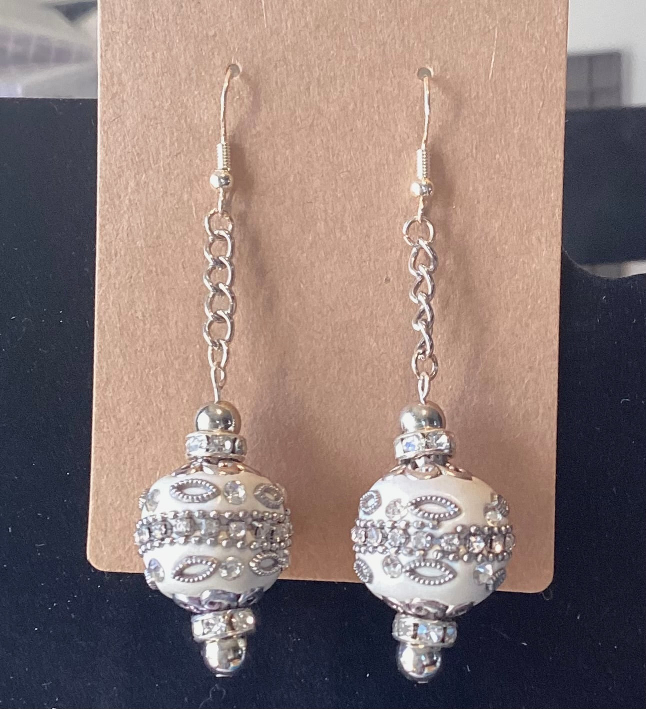 Add elegance to your look with these handcrafted dangle earrings, featuring intricately detailed white beads adorned with shimmering rhinestones and silver accents. The delicate chain drop adds graceful movement, making them perfect for both everyday wear and special occasions. Lightweight yet striking, these earrings are a beautiful blend of classic charm and modern sparkle—an essential accessory for any jewelry collection.