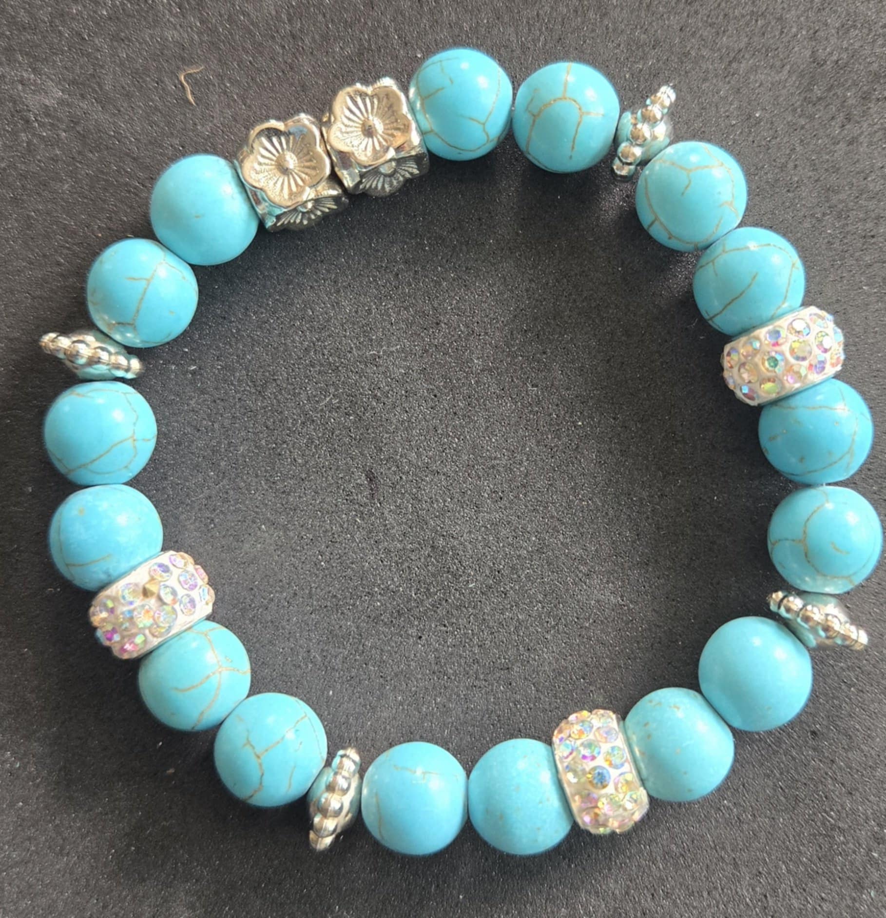 Turquoise colored beaded stretch bracelet featuring polished turquoise colored beads with natural marbling. Accented with rhinestone-studded spacer beads, silver-toned floral charms, and textured metallic separators. Comfortable stretch design fits most wrist sizes. Stylish and versatile, suitable for both casual and dressy outfits.