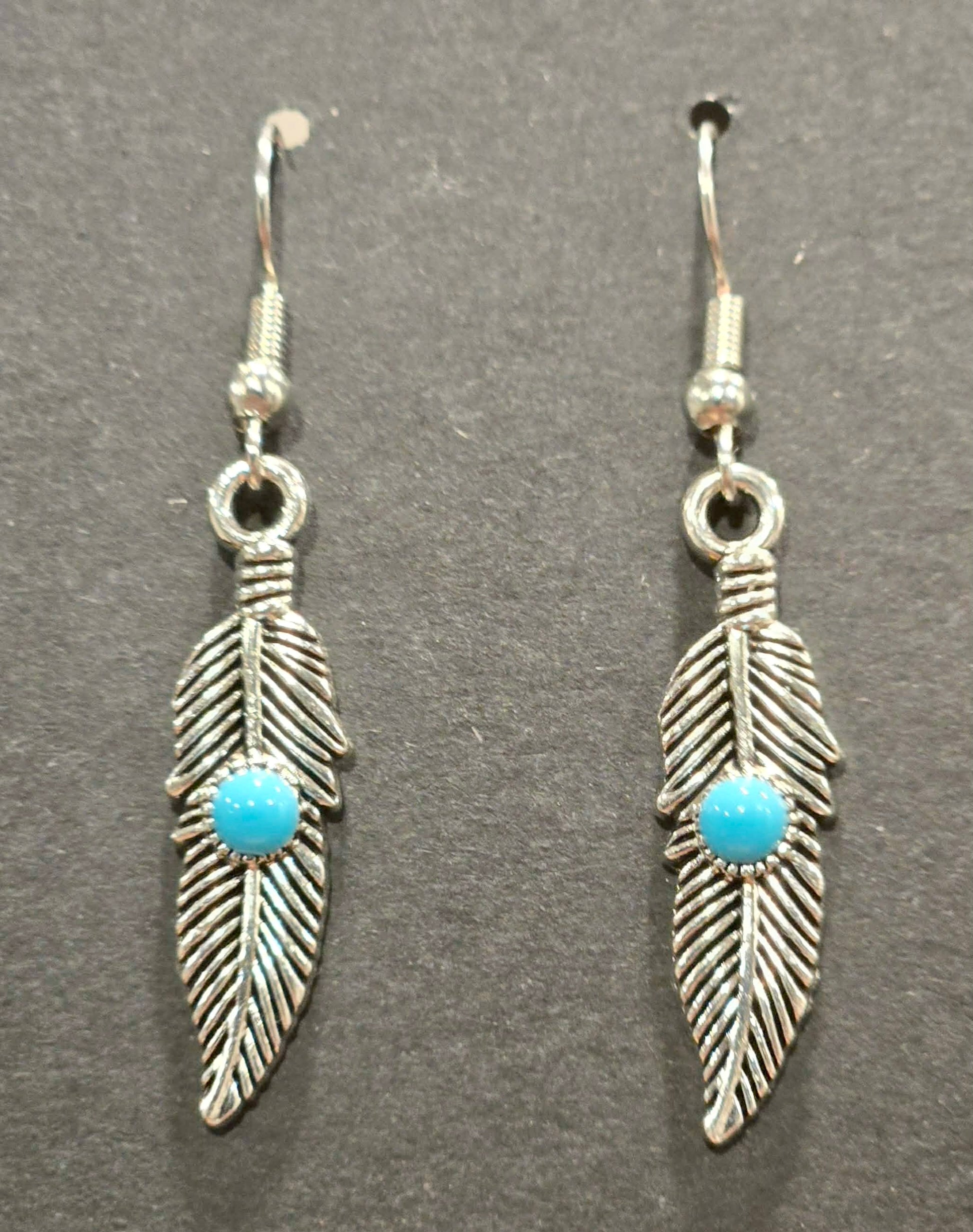 Add a touch of natural elegance to your look with these turquoise feather drop earrings. Featuring detailed silver-tone feather charms accented with a bright turquoise bead, these earrings offer a perfect blend of rustic charm and modern simplicity. Lightweight and easy to wear, they bring subtle movement and color to any outfit. Ideal for everyday wear or pairing with boho, western, or casual styles.