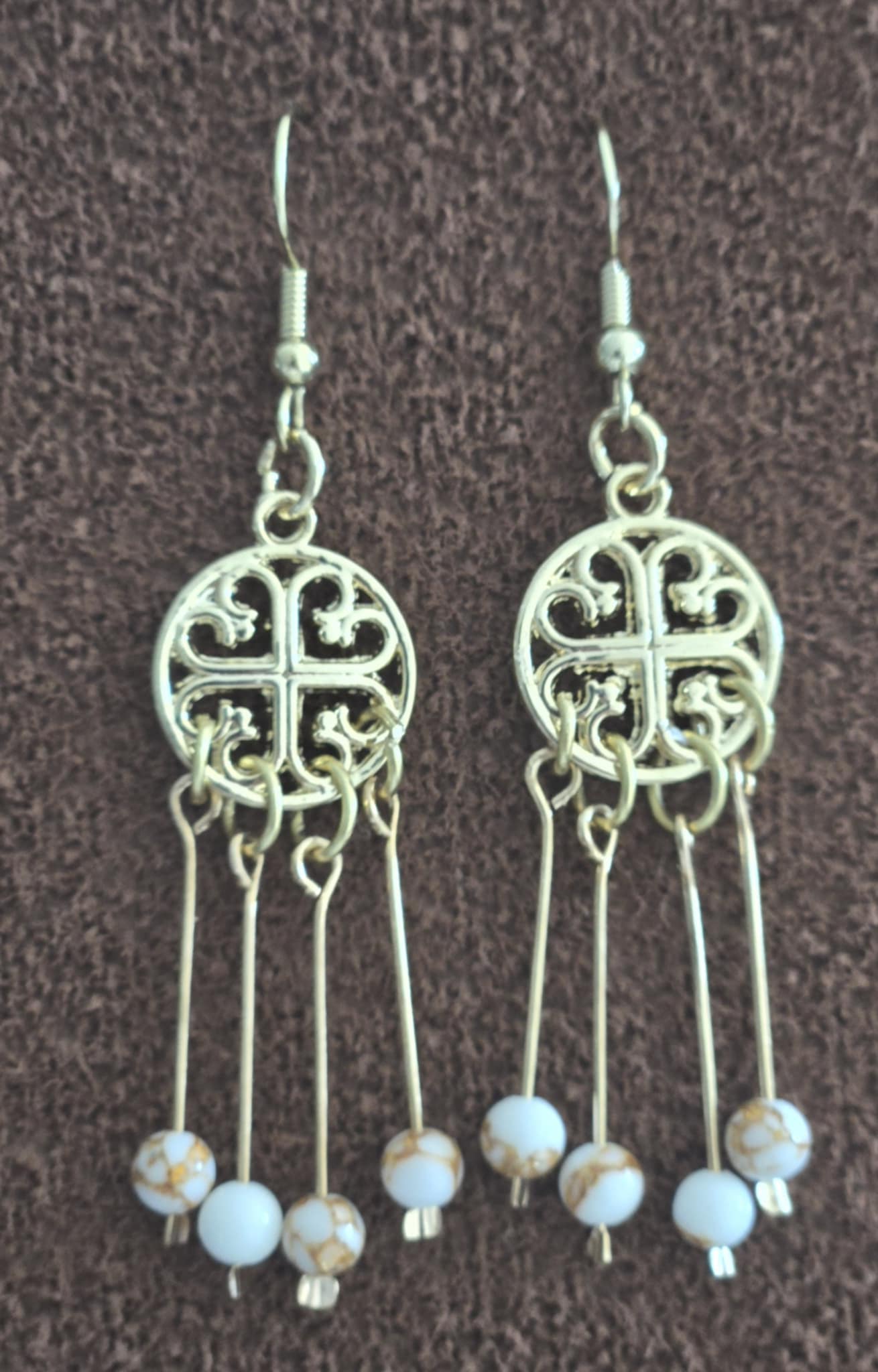 Elegant dangle earrings with a vintage-inspired design. Each earring features a round, gold-tone filigree medallion with a cross-like pattern at the center, accented by delicate scrollwork. Hanging from the bottom are five slender gold rods, each tipped with a small bead. The beads are white with golden-brown marbled patterns, adding a subtle touch of color and texture. The earrings have a graceful, bohemian style that blends intricate metalwork with earthy bead accents, making them suitable for both casual and dressy occasions.